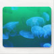 Atmospheric fotograph of transparent jellyfish swimming in a blue / green sea.