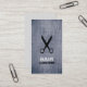 Moderne Visitenkartenvorlage mit minimalistischem Scherenmuster und blau gekratztem Holzhintergrund. Elegantes und modernes Design. Ideal für Schönheitssalon, Friseur, Friseur.
