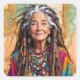 A fun ai illustration of a cool old hippie woman in dread locks with a tie dye background. Vibrant colors, unique artsy illustration of not your everyday old lady.
