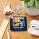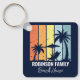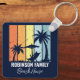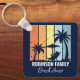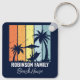 Personalisierter marineblauer Strandhaus Schlüsselanhänger für Ihre Zuhause in Hawaii, Florida oder anderen tropischen Inseldestinationen. Coole Palmen versetzen sich gegen die Retrofarben Orange und Gelb über Ihrem individuellen Urlaubsnamen in weißer Schrift. Ideal für Gruppen, die eine Kreuzfahrt oder einen Ausflug an die Küste unternehmen.