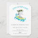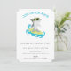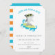 Cooler Surfhai, Geburtstagsfeier Einladung. Hai mit Sonnenbrille, Surfbrett und Meereswellen, "Join us for a Bite". Weiße, orangefarbene und blaue Streifenunterlage.