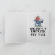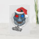 Schlangener T-Rex in 3-D Brille und eine Weihnachtsmannmütze wünschen Ihnen ein frohes Weihnachtsfest. Mit einem Mops, der einen T-Rex auf der Innenseite fährt.