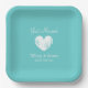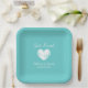 Cool türkisblaue und weiße Hochzeitsfeier Teller. Elegantes Design mit rustikalem Liebe Herz und stilvollem Schriftzeichen-Template. Fügen Sie die Namen der Braut und des Bräutigams sowie das Datum der Ehe hinzu. Beispiel: Tiffany & James. Trendy Theme, Teil des Set der Zusammenstellung mit koordinierten Farben. Schöne Innendekorationen, Accessoires und Party für Ehepaare.