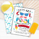 Lassen Sie uns von den Einladungen zum Pool-Geburtstag Cool werden. Ideal für das Party im Kinderbecken! Sonnenbrille, Popsikel, Beachball und schwimmende Schwimmerröhre mit Wasserspritzen in hellbraunen Pastellfarben.