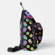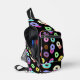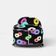Coole und lustige Donuts Muster schwarze Tasche. Muster hergestellt aus Illustrationen von vielen köstlichen Backen Donuts mit allen Arten von Farbverglasung, Schokolade, Vanille und alle Farben, blau, gelb, rosa, lila, cyan.