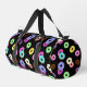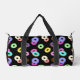 Coole und lustige Donuts Muster schwarze Tasche Mode Zubehör. Muster hergestellt aus Illustrationen von vielen köstlichen Backen Donuts mit allen Arten von Farbverglasung, Schokolade, Vanille und alle Farben, blau, gelb, rosa, lila, cyan.