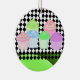 Eine Gruppe von bunten mattierten Kuchen in Rosa, Grüntöne, Blau und Lila auf einem schwarz-weißen Diamantboden.