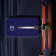 Elegante, individuell anpassbare dunkelblaue Gepäckmarke mit IMITATEN Metallstreifen und Ihrem fett-Monogramm.