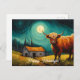Schöne Hochlandkuh mit Postkarte des Bauernhauses. Passen Sie die Nachricht einfach an Ihre Bedürfnisse an.