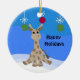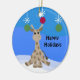 Ein niedliches Design für die Giraffenliebhaber. Ein blauer Hintergrund mit großen roten und grünen Ornamenten. Ein sitzender lächelnder Giraffe betont diesen Schmuck.