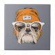 Dieses Ausrüstungsbeschreibungen ein Bulldoggenporträt in einem Hipsterhut und mit Gläsern.