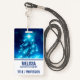 Nennen Sie Abzeichen mit einem Weihnachtsbaum geschmückt mit lebhaften elektrisch-blauen Urlaubsleuchten. Freuen Sie sich auf ein fröhliches Erlebnis.