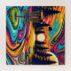Retro-Disc-Golfplatz mit psychedelischem Sonnenuntergang, Vollmond, wirbelnd farbiges Wasser.