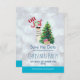 Save the Date Karte für ein Weihnachtsfest Party. Eine lustige Illustration. Ein niedliches Lamm mit schwarzer Sonnenbrille und einer roten Weihnachtsmannmütze. Stehend hinter einem Weihnachtsbaum mit festlichen Geschenken. Das Wort Joy schrieb über seinem Kopf in einem bunten Schriftart. Silver Bukh Hintergrund mit einem eisblauen Rand. Whimsical und Spaß Weihnachten Thema Design.