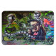 Schlangenaugen, die ihn anschauen, ein Mann mit Jeans-Jacke, rot-weißes Shirt und Fett im Haar, eine Art 50. Art Rock'n Rollgraffiti in Wien austria in Donaukanl