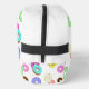 Coole und lustige Donuts Muster weiße Tasche Zubehör . Muster hergestellt aus Illustrationen von vielen köstlichen Backen Donuts mit allen Arten von Farbverglasung, Schokolade, Vanille und alle Farben, blau, gelb, rosa, lila, cyan.