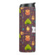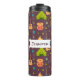 Eine Thermalwasserflasche mit einem lustigen Camping-Thema-Muster. Set auf rötlich-braunem Hintergrund. Elemente im Muster sind ein Lagerfeuer, ein Zelt, Gitarre, Schaufel und Rucksack. Personalisieren mit einem Namen.