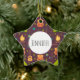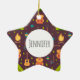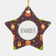 Ein Ornament, das mit einem niedlichen Camping-Muster entworfen wurde. Camping-Themen wie ein orangefarbenes Lagerfeuer, ein grünes Zelt, eine akustische Gitarre und andere Naturelemente wie Bäume, Blätter, aber auch ein Rucksack, Schaufel und Kantine. Coole Outdoorsie. Ein weißer Kreis lag oben mit einem personalisierten Namen innen.