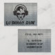Eine coole DJ-Logo-Cartoon Geschäftkarte Schablone. Ein atemberaubender beruflicher Entwurf mit DJ-Kopf mit Kopfhörer-Cartoon und dem Text DJ auf einem metallischen Hintergrund kombinierte mit dem Logo eines abstrakten Kopfhörers. eine gute DJ-Visitenkarte.