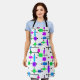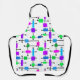 Diese Schürze hat ein modernes Design von einem Gitter aus horizontalen und vertikalen schwarzen Linien mit Rechtecken in verschiedenen lebhaften Grün-, Blau- und lila Farbtönen.