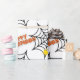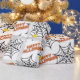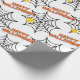 Halloween feiert man mit diesem coolen Wickelpapier, das Spinnennetze und Spinnen auf weißem Hintergrund zeigt. Orange Happy Halloween Text.