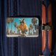 Entdecken Sie ein einzigartiges und unterhaltsames Design eines Kängurus, das coole Farbtöne ausstrahlt und in einem hellgelben Gehäuse und einer stilvollen Sonnenbrille gekleidet ist. Das Känguru sitzt gelegentlich auf einem Skateboard, Set gegen einen landschaftlichen, von hohen Palmen gesäumten Weg.