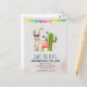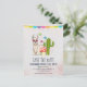Save the Date Postkarte mit einem extravaganten Banner am oberen Rand. Illustriert mit einem niedlichen Lamm mit einer herzförmigen Sonnenbrille. Einige Sterne, ein Pilz und ein grüner Kakteen ergänzen die Abbildung. Whimsical und niedlich.