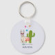 Personalisierter Schlüsselanhänger illustriert mit einem niedlichen Lamm mit einer herzförmigen Sonnenbrille. Einige Sterne, ein Boho-Pfeil, ein Pilz und ein grüner Kakteen runden das Bild ab. Whimsical und niedlich.