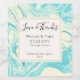 Ein stilvolles und raffiniertes Hochzeitsweinetikett mit elegantem Marmormuster aus Imitat, das in türkisfarbenen Blau- und Cremefarben schimmert. Ein cremefarbener Rahmen mit goldgelbem Rahmen überlagert mit personalisierten Hochzeitsinformationen und Weininformationen.