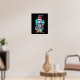Ein Poster mit einer Darstellung eines humorvollen Skeletts. Tragen Sie einen Tophut, halten Sie ein Getränk. Er hat ein großes Lächeln im Gesicht. Zu Halloween macht sich niedlich und spukhaft viel Spaß.