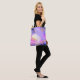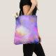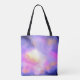 Eine elegante Tasche mit einer schönen Kombination aus weichen Pastellfarben und hellen Farben. Ein buntes abstraktes Bild mit einem kosmischen Raumbild in rosa, lila und gelben Wasserfarben. Die Farben vermischen sich und mischen sich, um helle ätherische Wolken zu erzeugen, die durch kleine funkelnde Sterne durchzogen werden.