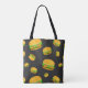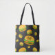 Persönliche personalisieren einzigartige modische Unisex überall auf Print Tote-Tasche mit Ihrem Initial und Namen. Cooles und lustiges Burgermuster auf dunkelgrauem Hintergrund. Yummy Vektorgrafik aus toasty Sesambun mit Fleisch, Salat, Tomaten und Käse. Burger, Hamburger, Lebensmittel, Fast Food, Fleisch, Käse, Salat, Bun, Brot, Tomaten, köstlich, Sesam, lecker, Rind, Salat, Jummy, Patty, frisch, Samen, Muster, Küche, kulinarische Grillen, scharf, saftig, Grill, Grill, Grill, ue, fastfood, burgers, lunch, mahlzeit, kochen,