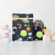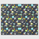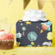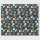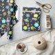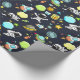Gemustertes Verpackungspapier mit einem niedlichen und farbenfrohen Muster mit allen möglichen Weltraum-Thematiken. Zu den Bildern zählen Astronauten, die in ihren Anzügen herumtreiben. Sterne und Planeten und coole kleine Raketenschiffe, Raumschiffe und Satelliten. Spaß und verrücktes Design.