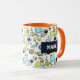 Personalisierte Kaffee-Tasse mit niedlichen und farbenfrohen Mustern mit allen möglichen Weltraummotiven. Zu den Bildern zählen Astronauten, die in ihren Anzügen herumtreiben. Sterne und Planeten und coole kleine Raketenschiffe, Raumschiffe und Satelliten. Spaß und verrücktes Design. Ideal für weltraumliebende Wissenschaftler.