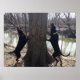 Dieses Poster enthält ein Foto von zwei schwarz-bräunlichen Münzhunden, die auf dem Fluss treten.