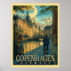 Entdecken Sie den Charme Kopenhagens mit diesem atemberaubenden Vintagen Reiseplakat. Die Abbildung zeigt einen Mann, der an romantischen Gebäude unter einem wunderschönen blauen Himmel vorbeiradelt. Ideal für ein Geschenk für Reisende.