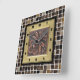 10.75” x 10.75” acrylic wall clock with an image of copper glass tiles and a square gold clock face with an embossed copper tile inset.