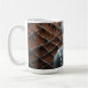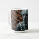 Artistic mug featuring a grayscale female portrait against a textured copper metal background symbolizing strength, beauty, and modern art.
