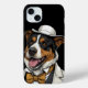 Australischer Schäferhund, der im Anzug drei weiße Stücke und einen Melonenhut spielt.