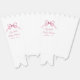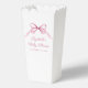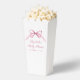 Niedliche Popcorn-Boxen aus Gastgeschenk für Ihre kleine Mädchendusche mit weichen, rosafarbenen Coquette-Bogen-Aquarellen. Die Wörter "Baby Shower" und der Name der künftigen Mutter werden in einem eleganten rosa Skript gezeigt.