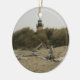 Aussicht auf das Coquille River Lighthouse vom Strand aus. Die Spitze schaut über den grasbewachsenen Bergkamm mit alten Treibholz im Sand. Das Hotel liegt im Bullards Beach Staat Park, in Bandon, Oregon.