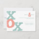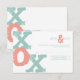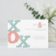 Diese korallenpfirsichrosa und minzgrün oder aquamarin blau oder wasserschaum moderne Hochzeitskarte enthält die Buchstaben XOX, die Sprossen und Küsse für eine skurrile, romantische und schicke stilvolle Ankündigung. Das kühne Aussehen verleiht dieser Frühjahrshochzeit eine lustige und künstlerische Atmosphäre und kann auch für Brautparty oder Polterabend lädt und gelobt Erneuerung und Jubiläum Party einlädt.