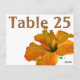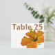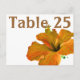 Tropische Blume Tischnummer Karten mit einem korallenfarbenen Hibiskus und Bronze-Ton Schriftart. Personalisieren Sie beide Seiten. Text kann auch personalisiert oder gelöscht werden.