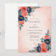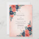 This romantic design features lush watercolor clusters of coral roses and navy blue anemones paired with delicate sage green foliage. A soft peach watercolor wash serves as a warm, artistic backdrop for the floral arrangements. The aesthetic combines deep indigo tones with vibrant salmon hues for a sophisticated and modern seasonal look.