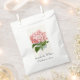 Eleganter, cremefarbener Geschmacksbeutel mit hübschen Bildern einer Korallenrosa Hydrangea. Personalisieren Sie den schwarzen, benutzerdefinierten Text für Hochzeitsfeiern. Ideal für Süßigkeiten und Süßigkeiten Bars.