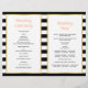 Hervorragende Korallenpfeife und schwarz-weiße Streifen gefaltet Hochzeitsfeier und Party-Programm. Herrliche pikante Blume schmücken dieses elegante und moderne Hochzeitsdesign. Ihr Text wird auf weißen Rahmen mit goldenen Konturen platziert. Wählen Sie das Wertpapier aus, da es sich gut faltet, und Sie müssen es halbieren.