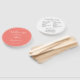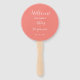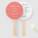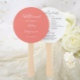 Hochzeitstag-Programm gedruckt auf einem runden Handventilator, der einen trendigen, korallenfarbenen Hintergrund auf der Vorderseite mit den Braut- und Bräutigamen in weißem, stilisiertem Skript aufweist. Auf der Rückseite des Programms sind die Teilnehmer der Hochzeitsfeier und die Zeremonie-Rites auf weißem Hintergrund mit dunkelgrauer Schrift aufgeführt. Bearbeiten Sie den Handventilator und ersetzen Sie die Informationen zum Hochzeitsprogramm durch Ihre eigenen. Ideal für eine Hochzeitsfeier im Innen- oder Außenbereich! Wählen Sie die gewünschte Anzahl von Hand-Lüfterprogrammen aus.