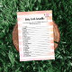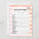 Genießen Sie dieses Baby Word Scramble Baby Duschspiel auf weichem, gürtelbraunem Pfirsich-, Korallen- und weißen Aquarellstreifen Hintergrund. Niedlich, rosa, Flamingo mit Muscheln aus weißem Marmor auf der Rückseite mit Vorlagen, die für Sie geschaffen wurden.
