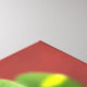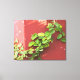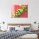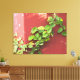 Eine grüne Weinrebe knistert um eine Wand und Ecke mit Korallenfarben. Der Kontrast zwischen den Farben ist stimulierend. Auf einigen Blätter sind Wasserperlen zu sehen.