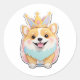 Happy Corgi mit winziger Krone und wackelnden Schwanz in Pastellfarben.